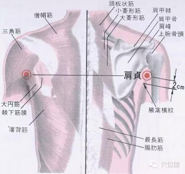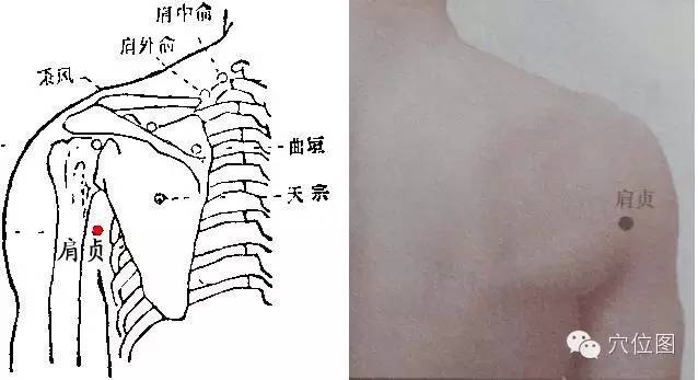 肩贞穴(SI9)属手太阳小肠经。肩贞穴的位置在肩关节后下方,臂内收时,腋后纹头上1寸。常用于治疗上肢瘫痪、肩关节周围炎、淋巴结节等。肩贞穴有散化小肠之热,使气血分散于肩之各部的功效,所以肩贞穴主治各种与肩膀有关的疾病,尤其对肩周炎的治疗效果甚佳。