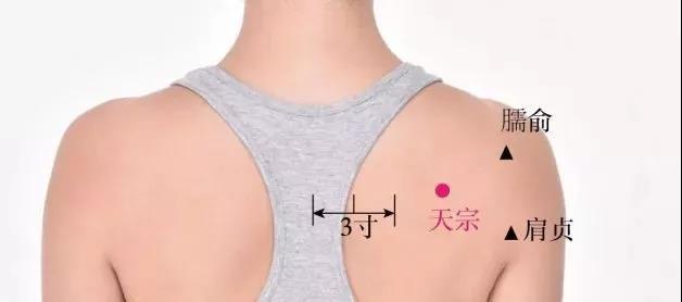 手指自然垂直,中指指尖所碰触之处就是天宗穴。点、按、揉此穴会产生强烈的酸胀感,可放松整个肩部肌肉。此外,按揉一分钟的天宗穴后加上一分钟的扩胸运动,会有意想不到的缓解疼痛的效果。