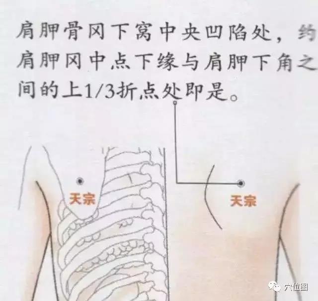 按摩法:患者以俯卧的姿势,按摩者将双手放在患者肩上,以指尖同时按压左右两侧的天宗穴。