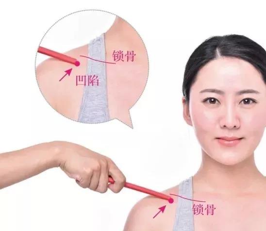 2.正坐位,以手叉腰。锁骨外端下方出现的三角窝的中点处。