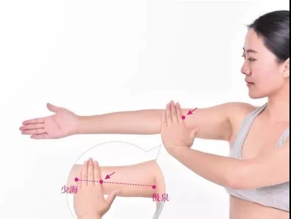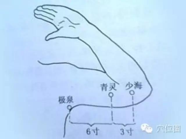 1.先取肘横纹尺侧端的少海,于少海穴4横指(即3寸)处,与极泉成直线位上。