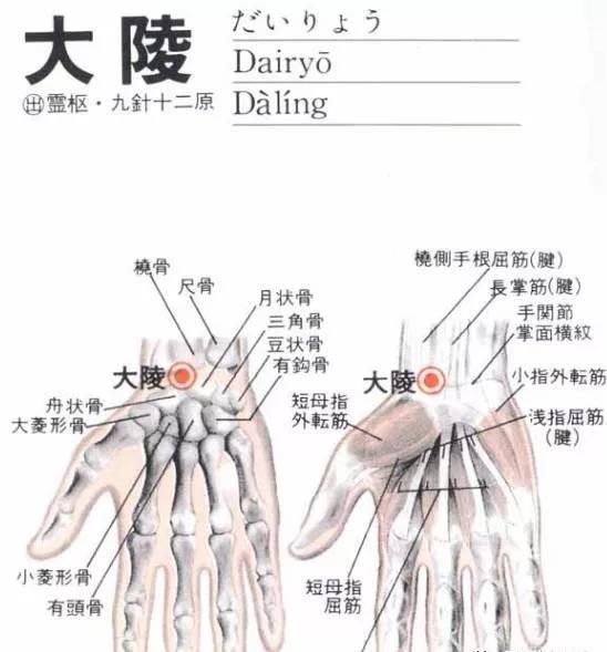 按摩方法:按摩时将大拇指陷入两条筋之间,并左右移动指尖给予刺激。用拇指指腹按压大陵穴,力度稍微重些,每次5分钟,每日2次。