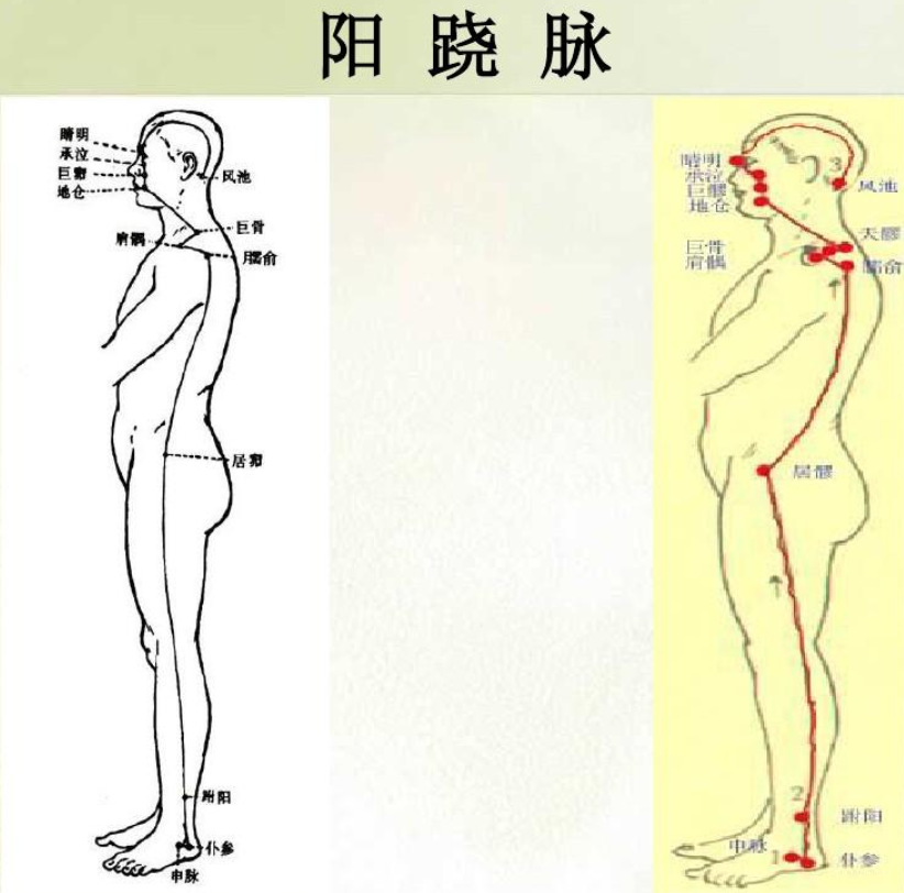 阳跷脉起于足跟外侧足太阳经的申脉穴,沿外踝后上行,经下肢外侧后缘上行至腹部。沿胸部后外侧,经肩部、颈外侧,上挟口角,到达眼内角。与足太阳经和阴骄脉会合,再沿足太阳经上行与足少阳经会合于项后的风池穴。