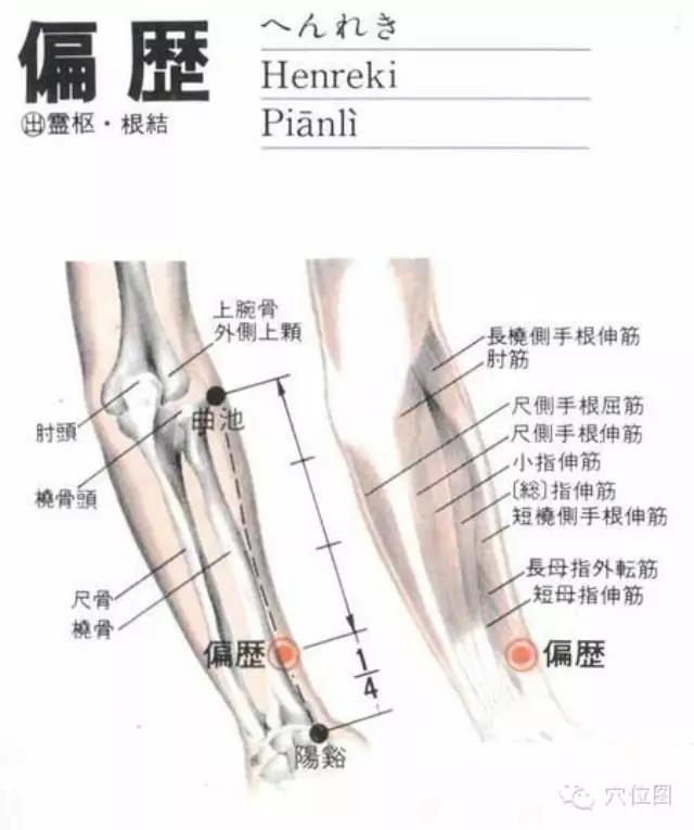 偏历穴(LI6)属手阳明大肠经之络穴,此腧穴的穴位位置在前臂背面桡侧,当阳溪与曲池连线上,腕横纹上3寸;有清泻阳明,通调水道的作用;临床上主要用于配合治疗耳鸣、鼻衄、手臂酸痛、腹部胀满、水肿等病症。