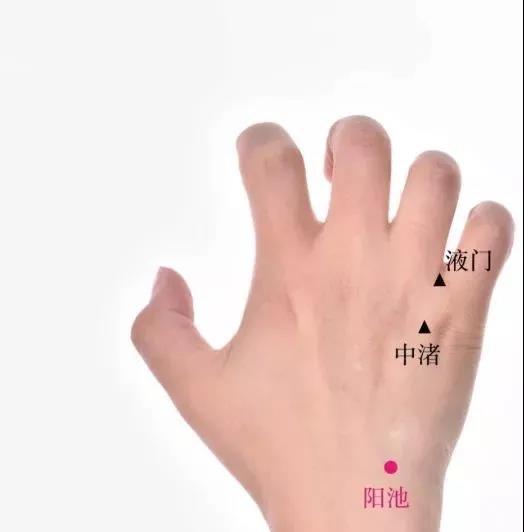 2.微屈指,位于手背腕横纹的中点,左右各一。手背朝上握拳,在腕关节的横纹与无名指延伸线的交接点上,有一个凹陷处,即阳池穴。