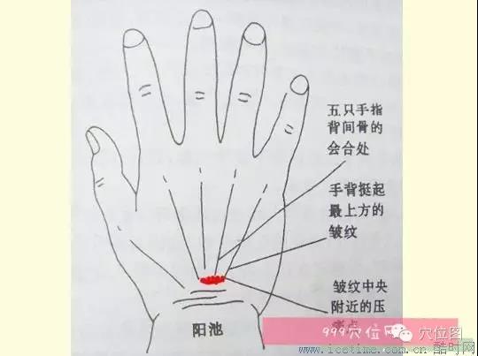 阳池穴是支配全身血液循环及荷尔蒙分泌的重要穴位。只要刺激这一穴位,便可迅速畅通血液循环,温和身体。刺激阳池穴,要慢慢地进行,时间要长,力度要缓。最好是两手齐用,先以一只手的中指按压另一手的阳池穴,再换过来用另一只手的中指按压这只手上的阳池穴。这种姿势可以自然地使力量由中指传到阳池穴内,还用不着别人帮忙。手脚发冷的女性,一般只要坚持刺激阳池穴,便可不为冬天的来临而发愁。