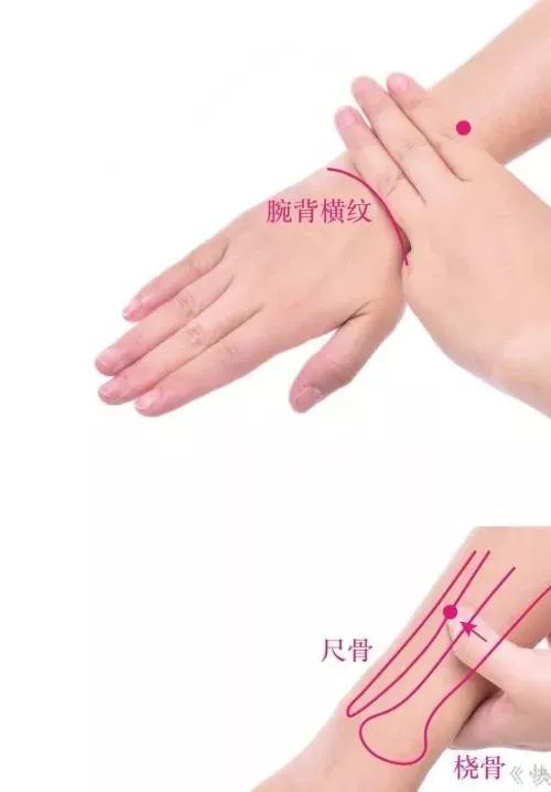 2.抬臂,在阳池与肘尖的连线上,腕背侧远端横纹上2寸。