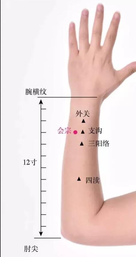 在前臂背侧,当腕背横纹上3寸,支沟尺侧,尺骨的桡侧缘。