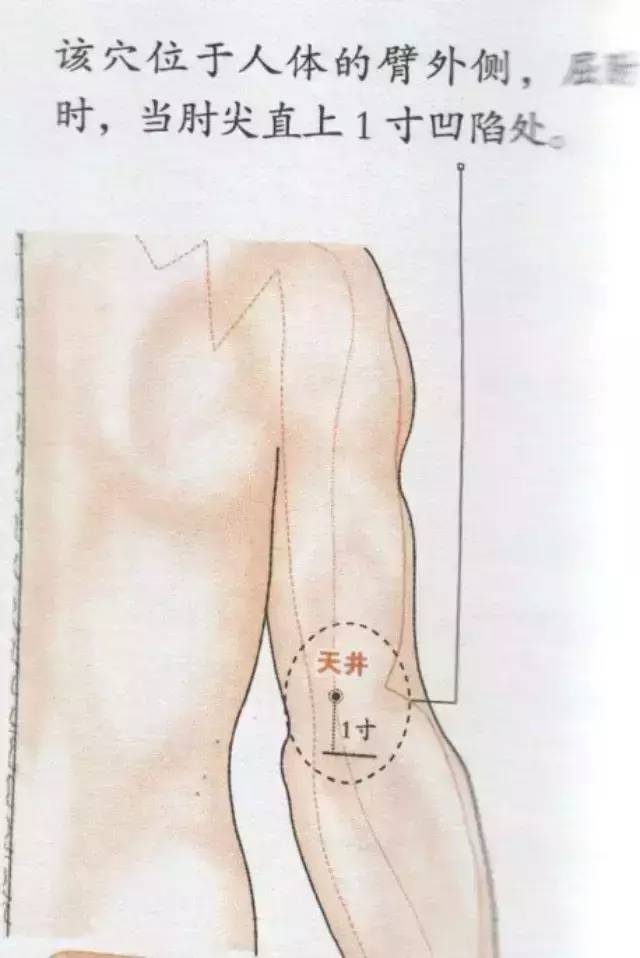 天井穴(SJ10)属手少阳三焦经,具有行气散结、通络安神的功效,那么天井穴在哪呢?其实它的位置在臂外侧,屈肘时当肘尖直上1寸凹陷处,常用于治疗偏头痛、肩臂痛、耳聋、颈项痛、胁肋痛等。除此之外,天井穴还是治疗淋巴结核的首选要穴。