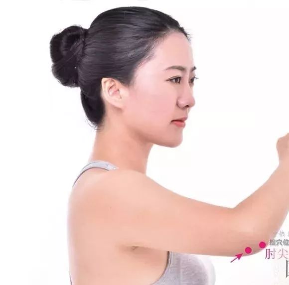 1、取坐位,以手叉腰,在臂外侧,于肘尖(尺骨鹰嘴。)后上方之凹陷处,按压有酸胀感。