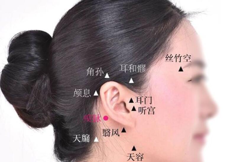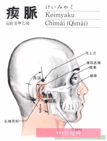 瘈脉chimai(SJ18)别名资脉穴,体脉穴,资生穴。属手少阳三焦经。瘛脉穴的位置在人体的头部,耳后乳突中央,当角孙穴与翳风穴之间,沿耳轮连线的中、下1/3的交点处。主治耳鸣,耳聋,头痛,小儿惊痫,瘈疭等。现在常用于治疗偏头痛、神经性耳聋等。
