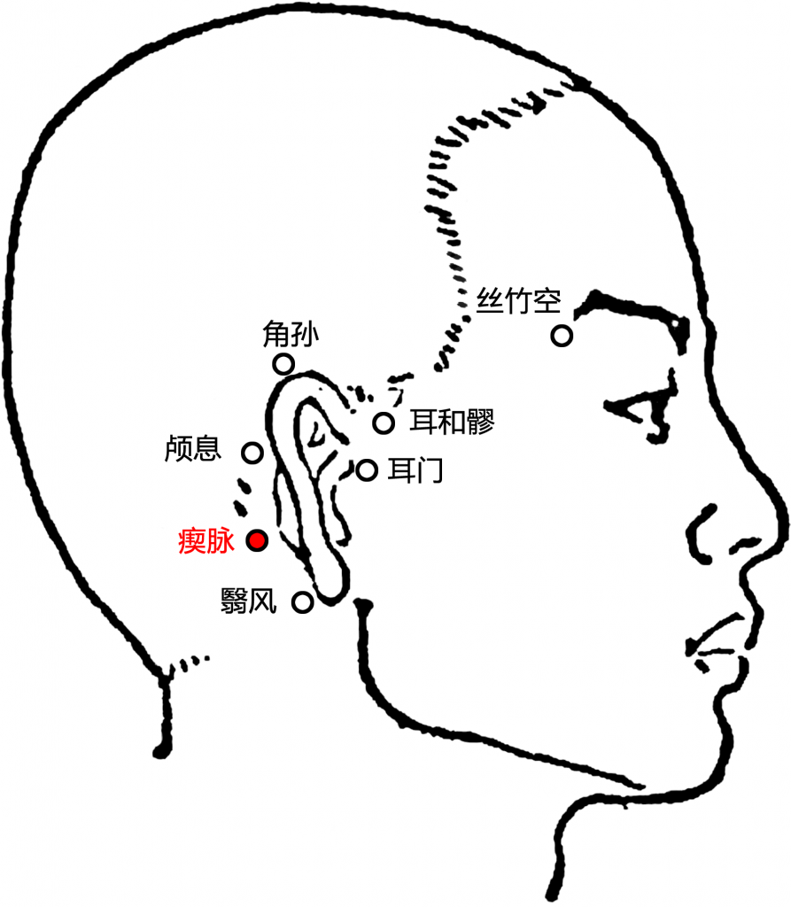 1)瘈脉。瘈,指犬的发狂之状,此指穴内气血为急速运行之状。脉,脉气也,经脉中的气血也。瘈脉名意指三焦经冷缩收引的下行水气在此急速胀散。本穴物质为颅息穴下传而来的水湿之气和翳风穴上传的阳热风气,二者相会后,水湿之气吸热并急速胀散冲出穴外,气之外冲如犬发狂时的狂奔之状,故名。