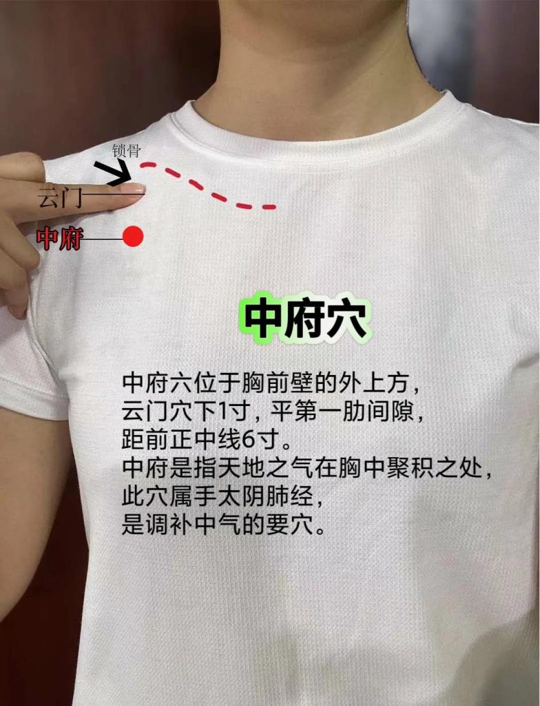 【定位】身体站直,双手叉腰,锁骨下方会出现一个凹陷,这个凹陷往下约一横指(大拇指宽度)的地方,按压有酸胀感,就是中府穴。它是肺经的起始穴,是肺气汇聚的地方。