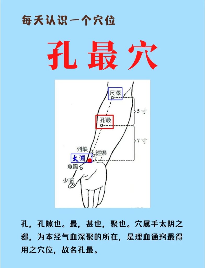 【定位】伸出手臂,从手腕横纹到肘横纹是12寸。从手腕横纹(太渊穴)往上7寸的位置,也就是大概在手臂的中间点偏上一点,就是孔最穴。