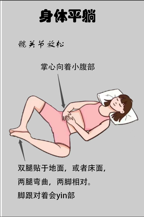 仰卧在床上时,双脚心相对,膝盖朝两边打开,尽量靠近床面,双手十指交叉,放在头顶,或者自然地放在下腹部,保持这个姿势20分钟,自然而然地就能感觉到大腿内侧有明显的拉伸感。