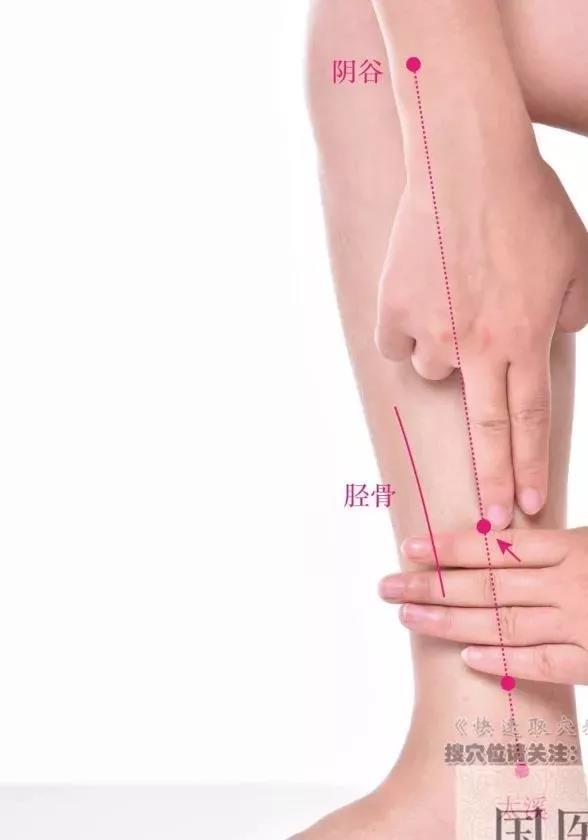 正坐或仰卧位,在太溪上5寸,太溪与阴谷的连线上,约当腓肠肌内侧肌腹下端处取穴。