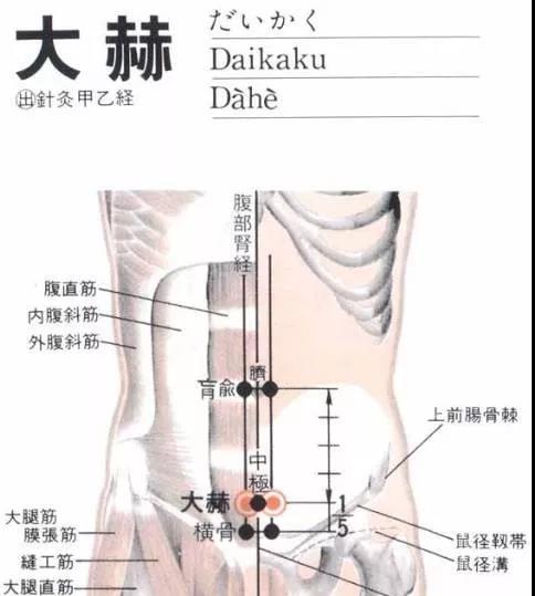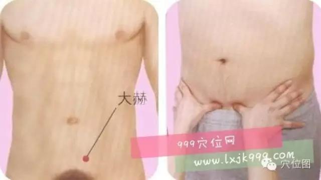 大赫穴Dàhè(KI12)穴位的位置在在下腹部,脐中下4寸,前正中线旁开05寸。从肚脐到耻骨上坊画一线,将此线五等分,从肚脐往下五分之四点的左右一指宽处,即为此穴。为人体足少阴肾经上的重要穴道。