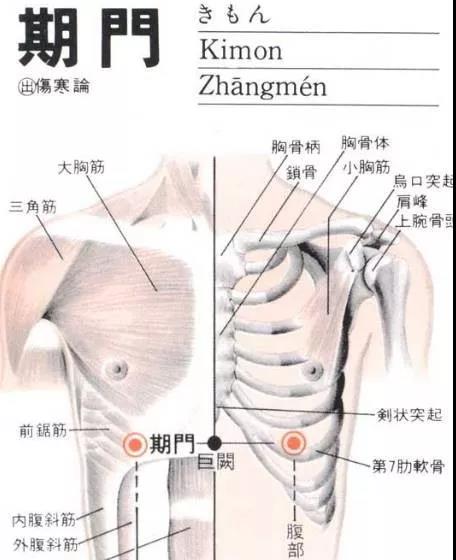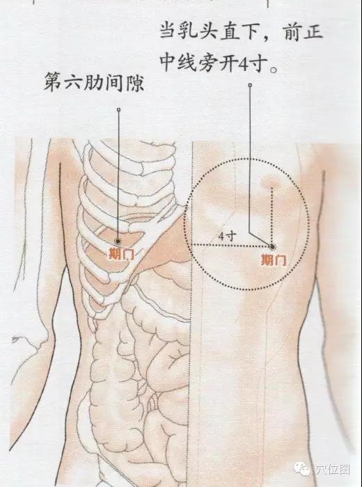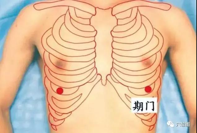 期门穴Qīmén(LR14)为肝经的最上一穴,期门穴属于足厥阴肝经,为肝经的募穴,肝经、脾经、阴维脉的交会穴。穴位的位置胸部,当乳头直下,第6肋间隙,前正中线旁开4寸,在章门穴上面。主要作用可治肝病、胸部疼痛、荨麻疹等。