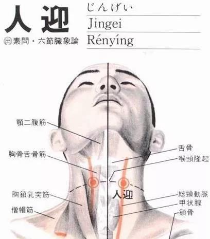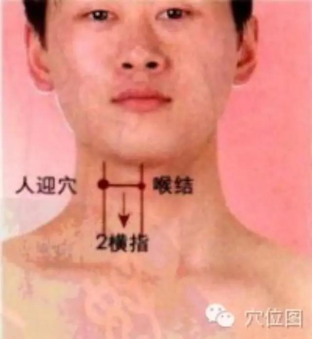 人迎穴属于足阳明胃经,被点中后气滞血淤、头晕。人迎穴位于颈部,喉结旁,当胸锁乳突肌的前缘,颈总动脉搏动处,前颈喉结外侧大约三厘米处。人迎穴是人体“气海”输注的穴位,是调气、补气的主要穴位之一。指压人迎穴也能使血液循环顺畅,使脸部的小皱纹消失,恢复肌肤的柔嫩光滑。另外,还可以减缓咽喉痛、音哑等症状。