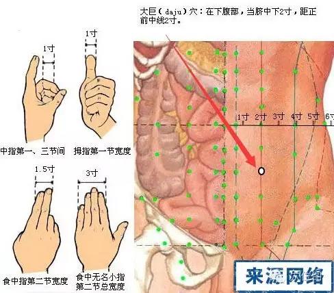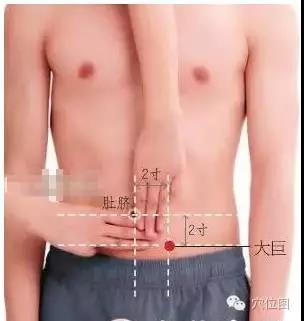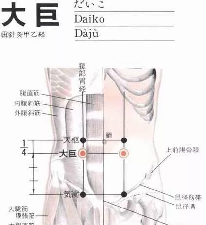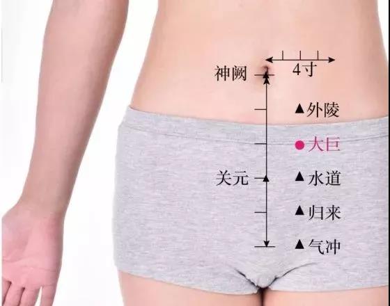 【大巨穴】位于下腹部,当脐中下2寸,距前正中线2寸。(即:石门穴旁开2寸处,当天枢下2寸。)