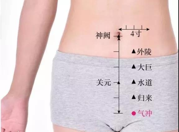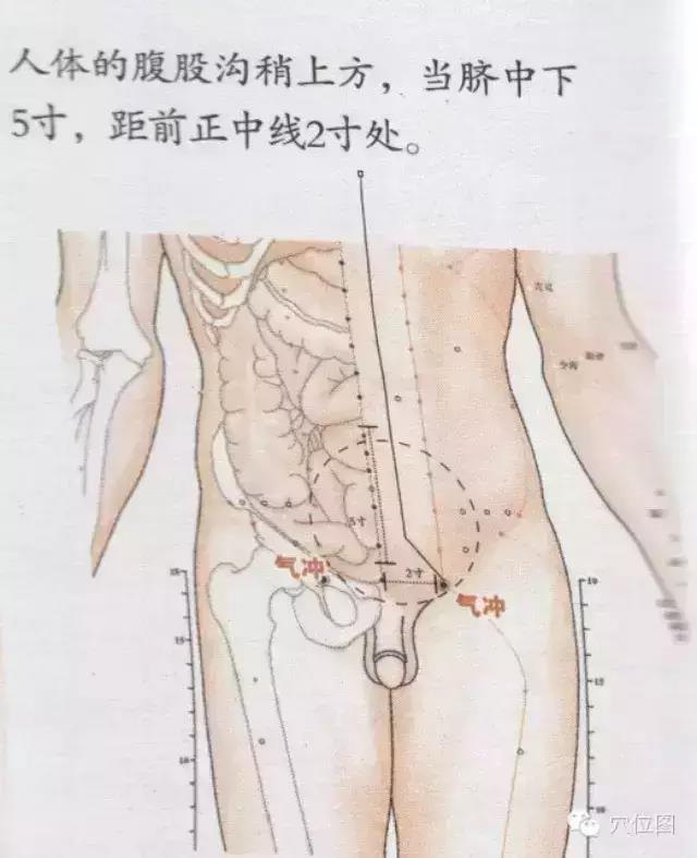气冲穴qìchōng【ST30]。别名:气街穴,羊屎穴,是足阳明胃经穴。气冲穴在哪个位置呢?其实气冲穴穴位的准确位置在人体的腹股沟稍上坊,当脐中下5寸,距前正中线2寸。在此穴位的下边,则可以摸到一根跳动的动脉。气冲穴的作用:腹痛、肠鸣、疝气、月经不调、不孕、阳痿、偏坠、睾丸肿痛、小便淋漓、阴肿等。