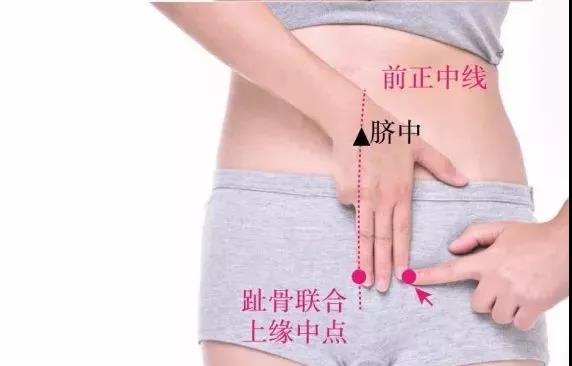 2.仰卧位,从耻骨联合上缘中点,水苹旁开约2横指,按压有酸胀感。