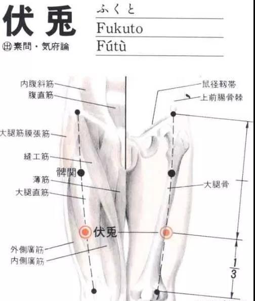 伏兔穴Fútù(ST32)属足阳明胃经。这个穴位在临床上不常用,所以图片上一般很少标示,伏兔穴具体位置在梁丘穴的上方,伏免穴合足三里、梁丘穴属同一经络。在大腿前面,当髂前上棘与髌骨外侧端的连线上,髌骨上缘上6寸。伏兔穴的作用:腰痛膝冷,下肢麻痹,疝气,脚气。
