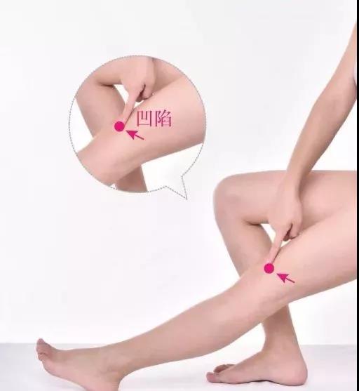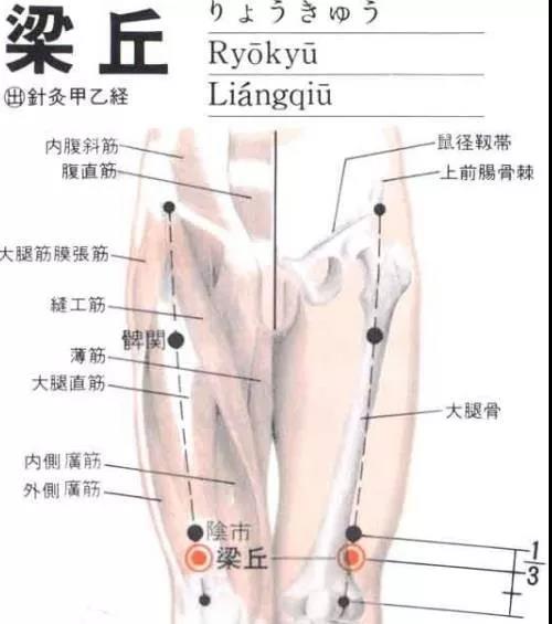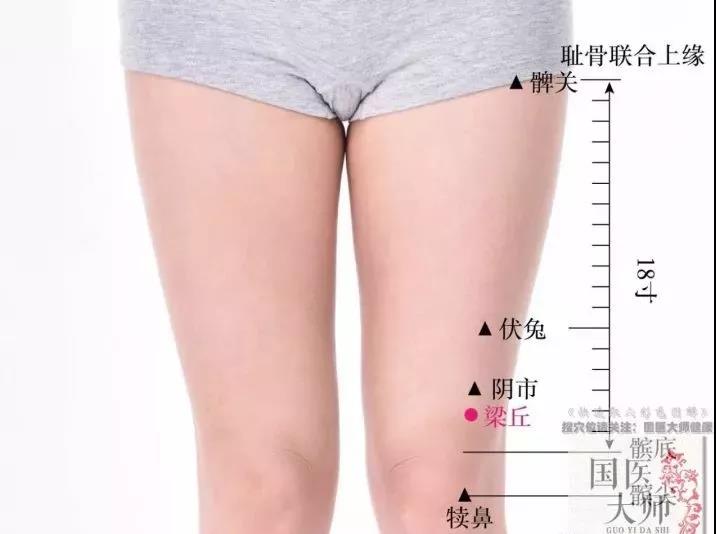 梁丘穴(ST34),属足阳明胃经,足阳明之郄穴。找穴时左腿用右手、右腿用左手以食指第二关节沿胫骨上移,至有突出的斜面骨头阻挡为止,指尖处即为此穴。梁丘穴常用于治疗胃痉挛、乳腺炎、膝关节病变等。另外还有调理脾胃的作用,其为治疗胃肠病痛的名穴;长时间站立或行走所导致的膝部疼痛,可用带密封盖的热水杯热敷此穴后,再进行按摩。用拇指朝大腿房向按压或揉按此穴1分钟。