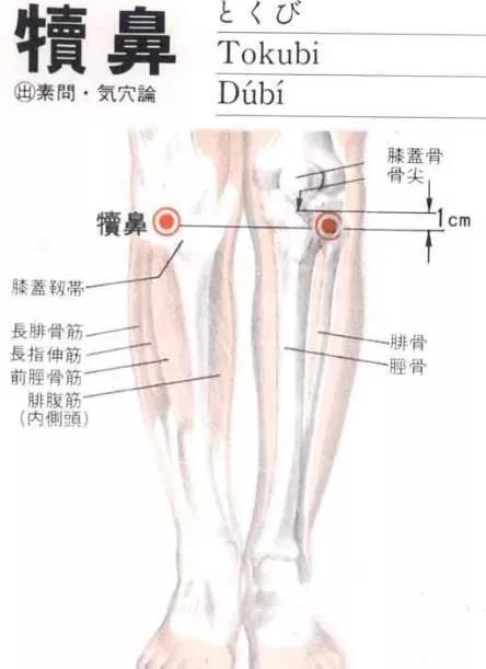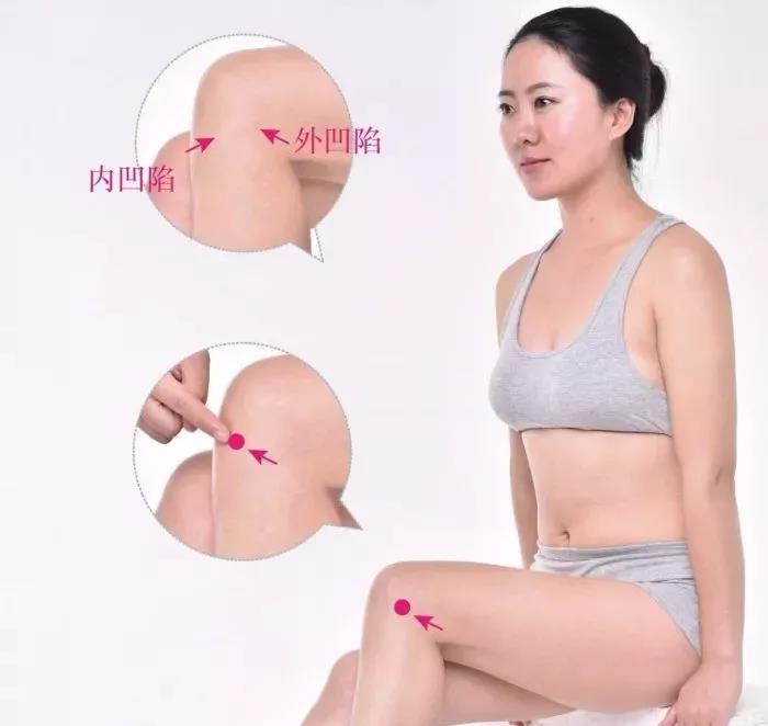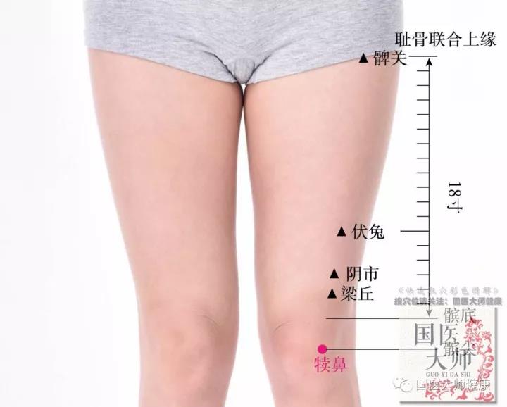 屈膝,在膝部,髌骨与髌韧带外侧凹陷中。