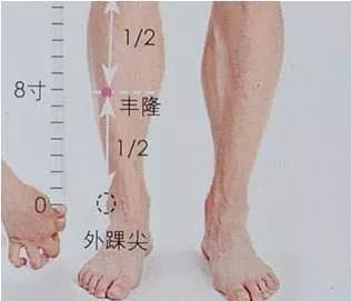 定位丰隆穴位置:仰卧或正坐垂足,在外膝眼(犊鼻穴)下8寸,即外踝最高处与外膝眼联机之中点,距胫骨前缘二横指处取穴。