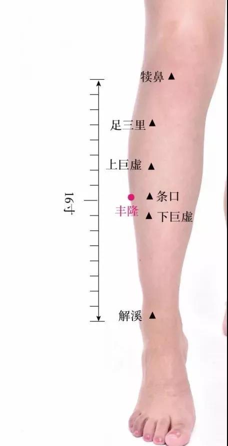 丰隆穴是胃经的络穴,又联络脾经。丰隆穴能调治脾合胃二大脏腑,有很好的除湿祛痰的效果。丰隆穴位的位置在人体的小腿前外侧,外踝尖上八寸,条口穴外,距胫骨前缘二横指(中指)。