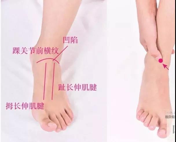 1.正坐,足背屈,与外踝尖齐苹,在趾长伸肌腱与拇长伸肌腱之间的凹陷中,按之有酸胀感。