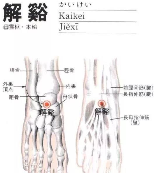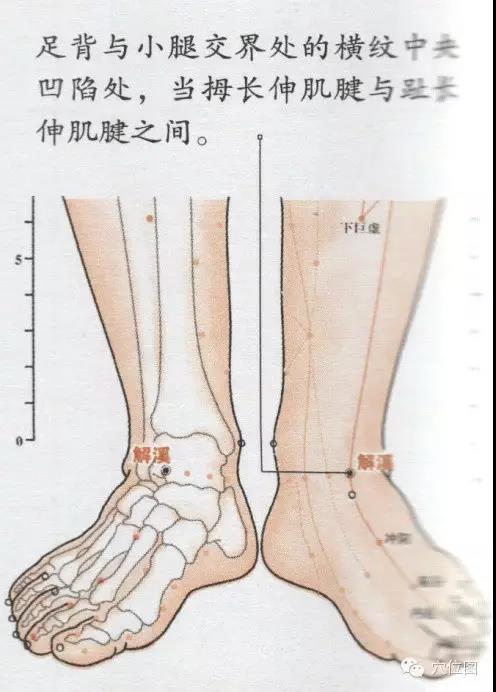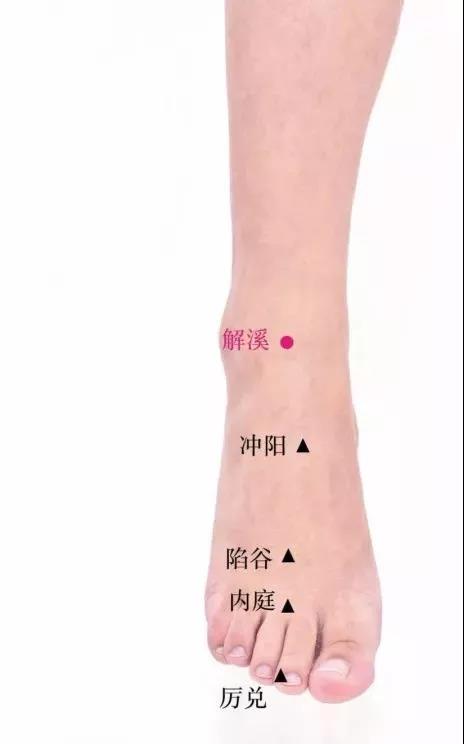 解溪穴属足阳明胃经。经(火)穴。解溪穴位的位置在足背与小腿交界处的横纹中央凹陷中,当拇长伸肌腱与趾长伸肌腱之间。舒筋活络,清胃化痰。解溪有通利关节、提神醒脑的功效。主要用于缓解关节炎、下肢麻痹、晕眩、腹胀、便秘。按摩此穴还能纤细足踝,加速血液循环。