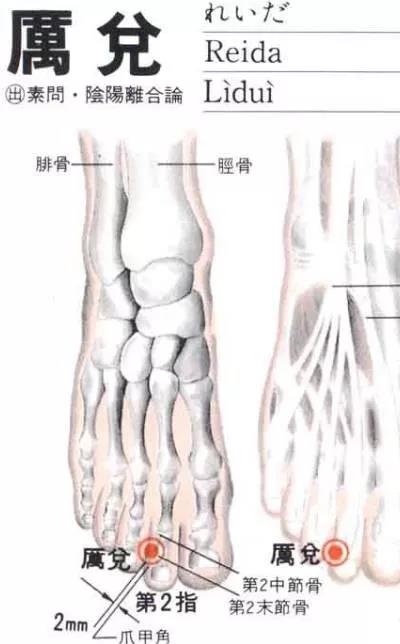 厉兑穴归属足阳明胃经,有缓解治疗面肿、齿痛、咽喉肿痛、心腹胀满等作用,厉兑穴的位置:足第2趾末节外侧,距趾甲角0.1寸,详见本文图解厉兑穴的准确位置图及穴位疗法。