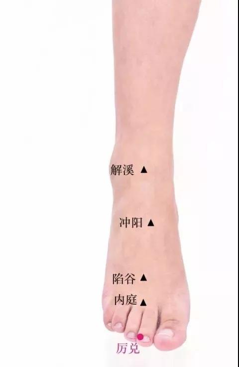 【厉兑穴位配伍】厉兑穴配内关穴、神门穴治多梦;厉兑穴配太阳穴、百会穴、足三里穴治肝炎;厉兑穴配太阳穴治脑贫血;厉兑穴配条口穴、三阴交穴,具有温经散寒、活络止痛的作用,主要治疗胫寒不得卧;厉兑穴配隐白穴,具有宁心安神的作用,主要治梦魇不宁;厉兑穴配隐白穴、中冲穴、大敦穴,具有豁痰、醒脑开窍的作用,主要治中风昏迷。