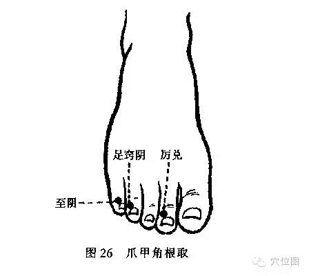 【取穴方法】正坐,在足第2趾,由足背第2趾趾甲外侧与趾甲下缘各作一垂直线之交点处。