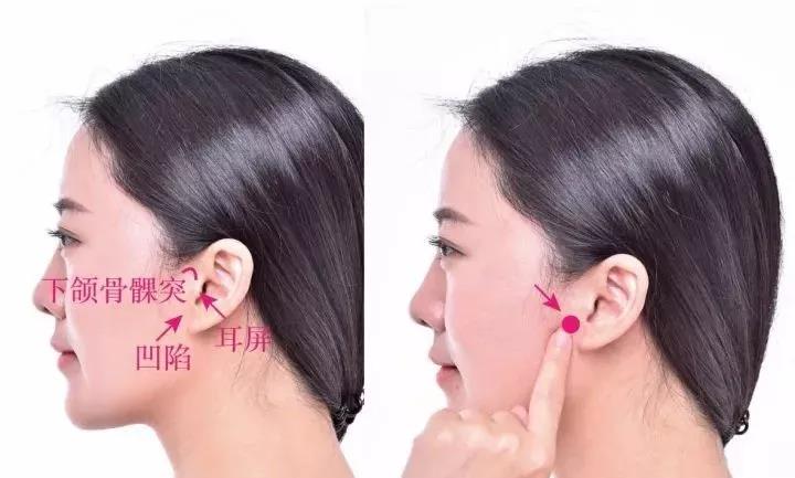 侧坐位,张口取穴,手置于耳屏下坊、下领骨髁突后缘,按压有一凹陷,张口时凹陷更明显,按压时可有酸胀感。