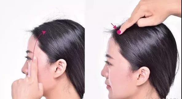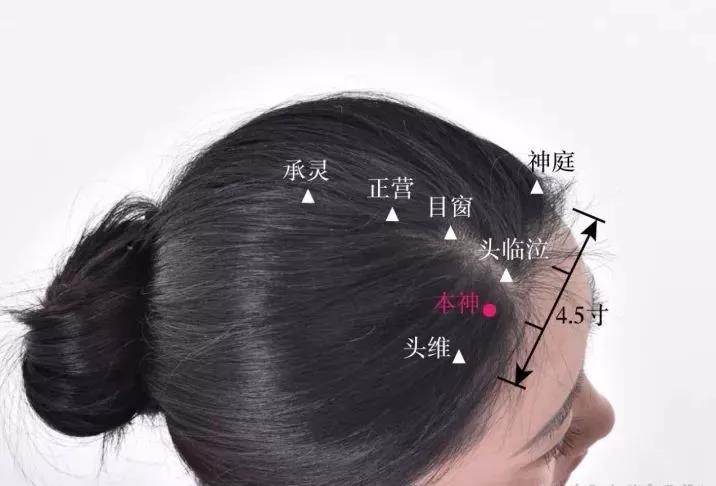 在头部,当前发际上0.5寸,神庭旁开3寸,神庭与头维连线的内三分之二与外三分之一交点处。