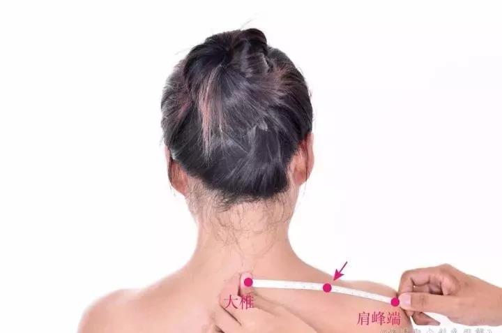 3 、在肩膀上较深的凹陷中,当右手随意搭在左肩上,右拇指贴于颈部左侧,右中指尖下即为此穴所在。