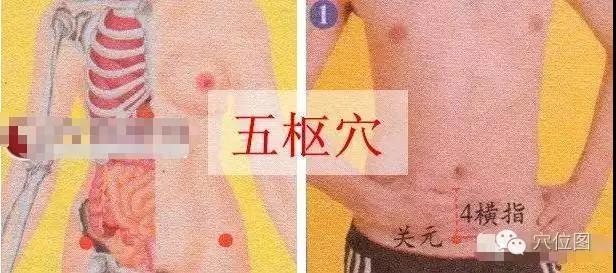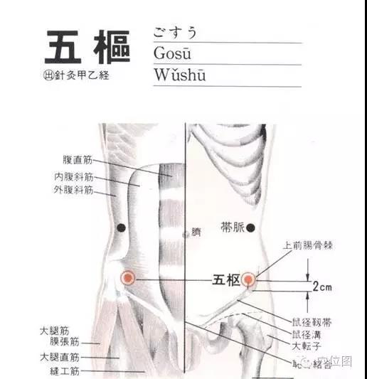 【五枢穴】位于人体侧腹部,当髂前上棘的前方,横平脐下3寸处。
