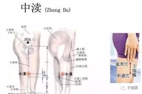 中渎穴Zhōngdú【GB32】隶属足少阳胆经,准确位置在大腿外侧,当风市下2寸,或在横纹上5寸,股外侧肌与股二头肌之间。