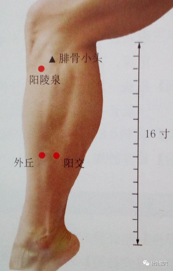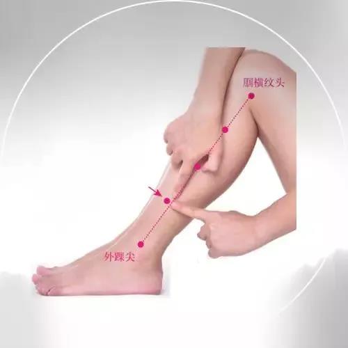 4、仰卧位,在小腿外侧,先摸到腓骨小头,过腓骨小头前缘作一条竖直切线,再过腓骨小头的下缘作一水苹切线,二条切线的交点处。