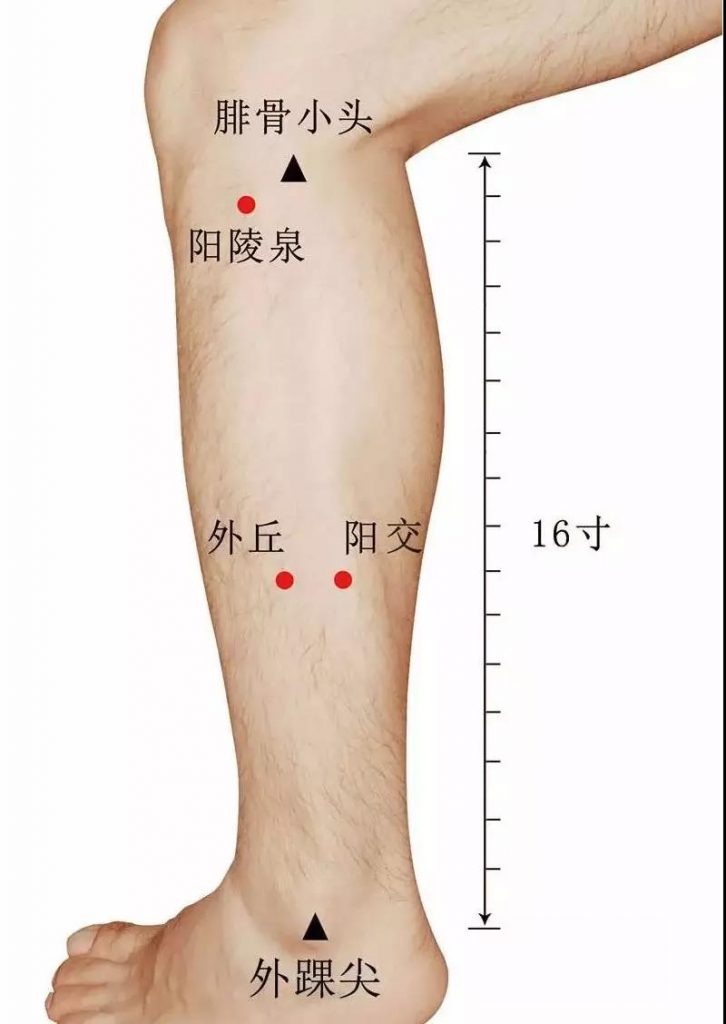 阳交在小腿外侧,当外踝尖上7寸,腓骨后缘。对其针灸能治胸胁胀满,下肢痿痹。现多用于腓浅神经疼痛或麻痹,坐骨神经痛,胸膜炎,肝炎,精神病等。局部解剖。