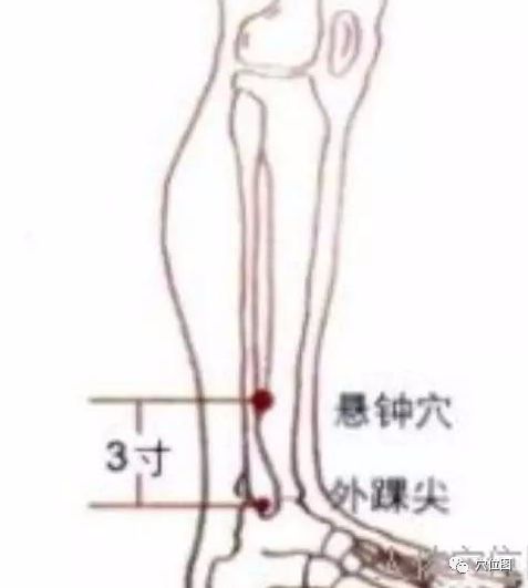 悬钟穴又叫做绝骨穴,是足少阳胆经上的大穴。八会穴之髓会穴。悬钟穴的准确位置在小腿外侧,当外踝尖上3寸,腓骨前缘。顾名思义,它合骨、髓都关系密切,专管人体骨髓的汇集,对与骨合髓有关的疾病都有治疗作用。会穴的特点就是一穴连着数条经络,所以地位至关重要。