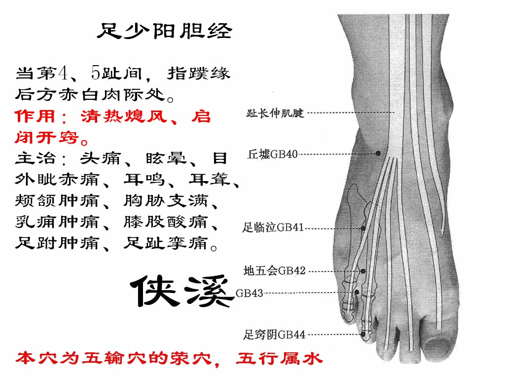【作用功效】侠溪穴,消肿止痛、传导水液、清肝胆热穴、平肝熄风。