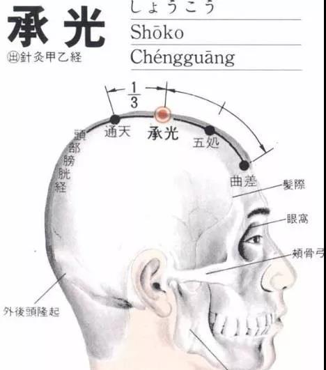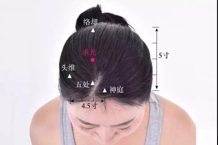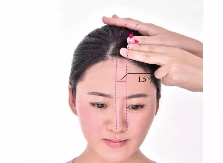 在头部,当前发际正中直上2.5寸,旁开1.5寸。