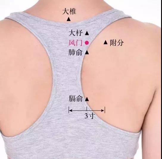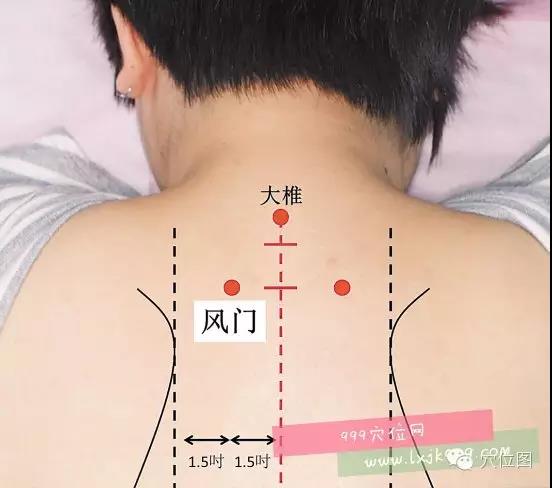 风门穴(BL12)是足太阳膀胱经的第12个穴位,又有热府,热府俞之称。又有左为风门,右为热府之说。为督脉、足太阳经交会穴。风门穴穴位的准确位置在背部,从朝向大椎下的第2个凹洼(第2胸椎与第3胸椎间)的中心,左右各2厘米左右之处,这个穴位的位置,刚好对应到人们的两扇肺叶,所以对肺的影响非常大。