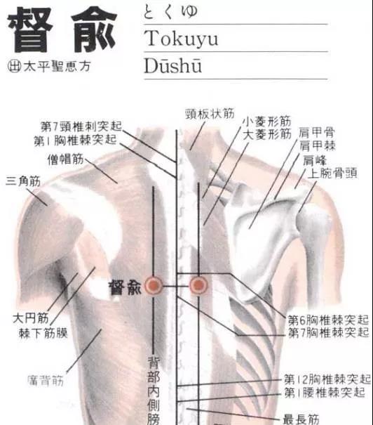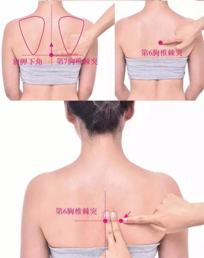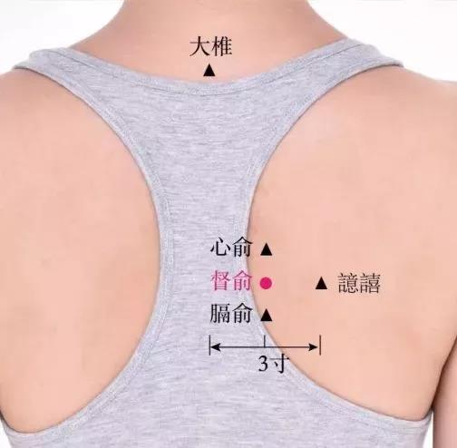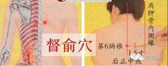 【督俞穴】位于人体的背部,当第6胸椎棘突下,旁开1.5寸。