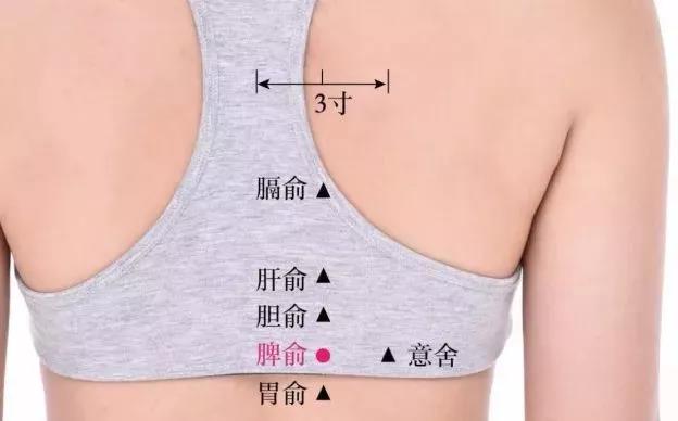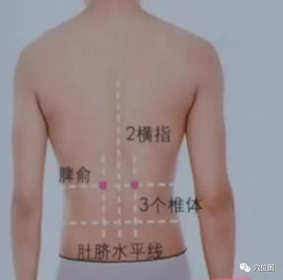 脾腧穴位置:找到两侧肩胛骨下角,往中间划水平线,相对的是第七胸椎,然后下属四个椎体左右旁开1.5寸是脾俞,然后相对下移一椎体是胃俞。