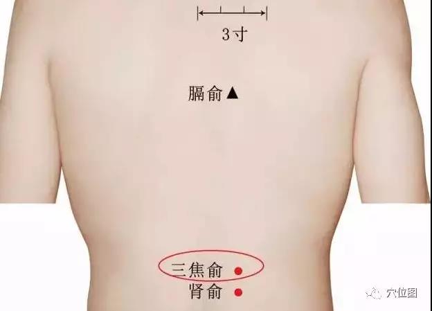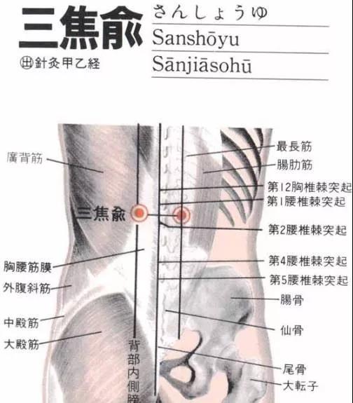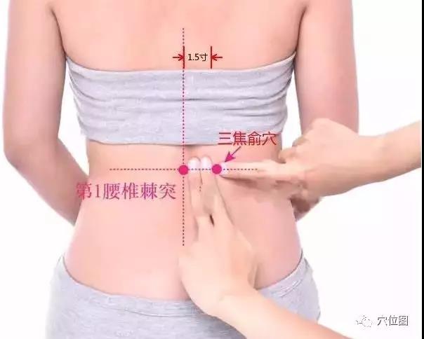1、腰系上腰带,腰带正好在左右腰骨上。以线连结左右腰骨的最高处。此线正好通过第四腰椎骨,然后,从此骨往上的第二个凸骨即第二腰椎骨,第三个凸骨是第一腰椎骨,三焦俞穴就从这两块凸骨的中央起,往左右各二指宽处。